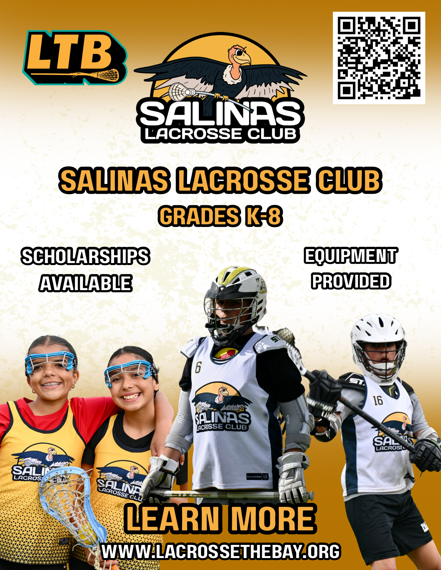 Salinas Lacrosse Club 2026 K-2 Intro to lacrosse detailsMarch 3 - May 8Location: Madonna Del Sasso ElementarySchedule: 8 sessions (Each includes 1 hour of practice & 1 hour of games)Tournaments: End-of-season play day with other local clubsGear: Equipment Provided if Needed Cost: $329If you live in Salinas, register for the Salinas Program If you live in Monterey, register for the Peninsula Program Grades 3-8 Registration K-2 Intro to Lacrosse Competitive Spring SeasonFeb - May For boys and girls grades 3-8:Schedule: 2 Practices per Week starting in FebruaryWeekly Games (8 Minimum) Carmel Cup End of Season TournamentEquipment Provided if NeededCost: 10U—$429, 12U—$529, 14U—$559If you live in Salinas, register for Salinas Lacrosse Club If you live in Monterey, register for Peninsula Lacrosse Club Check out our tentative practice schedules! Spring 2026 Practice Schedules
